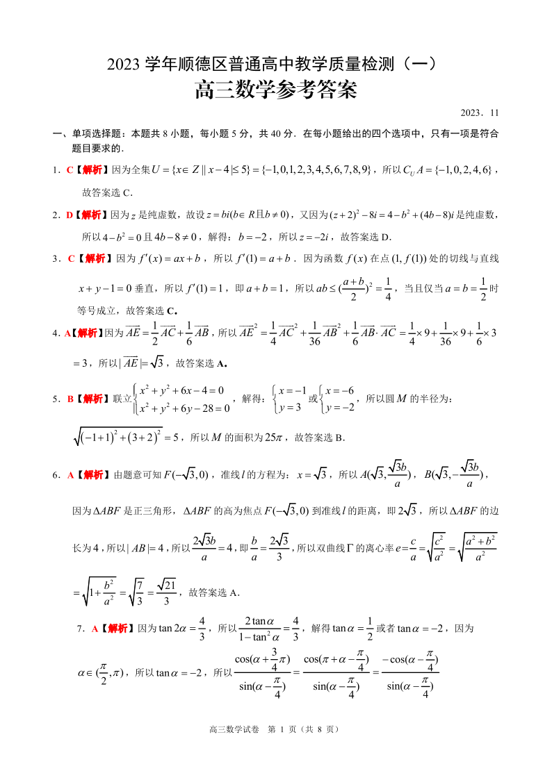 广东省顺德区2024届高三上学期教学质量检测(一)数学答案