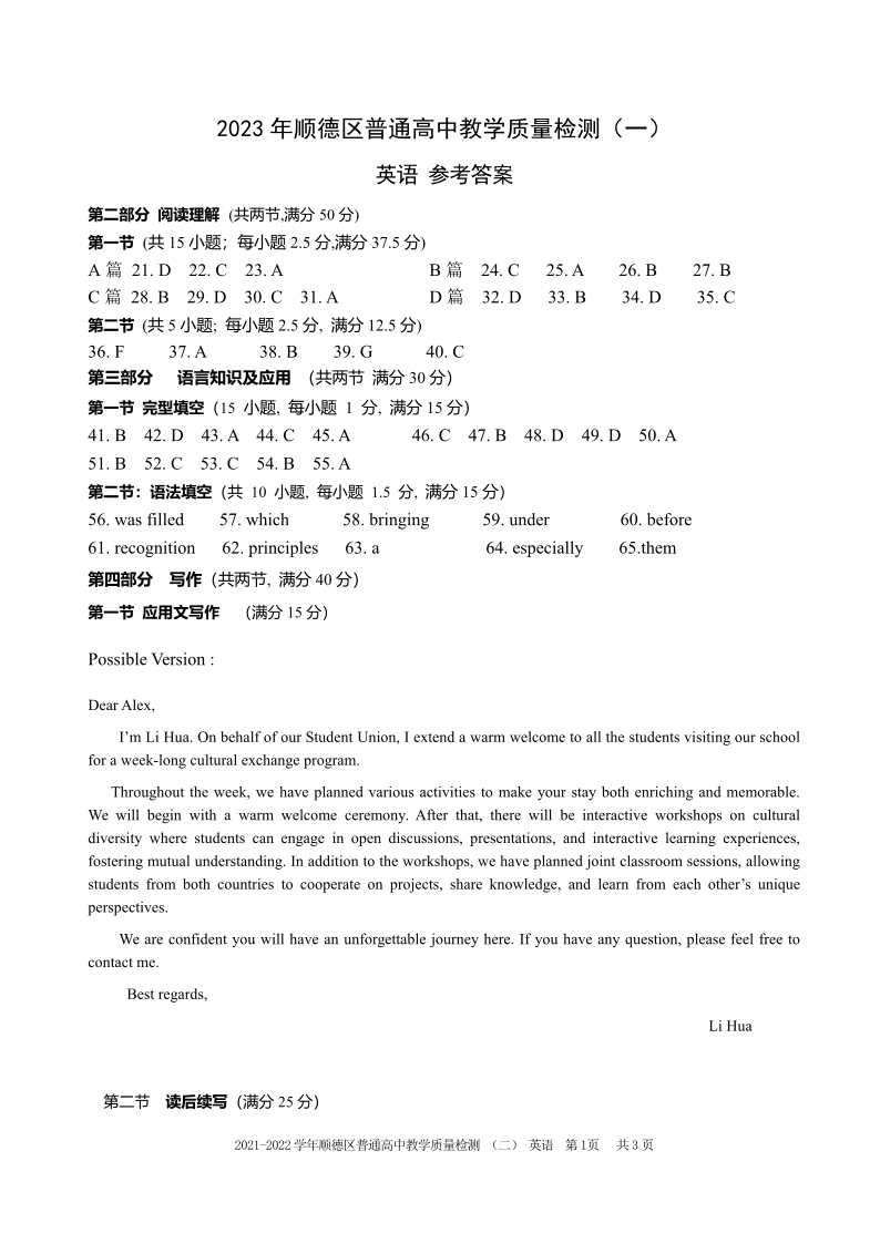 广东省顺德区2024届高三上学期教学质量检测(一)英语答案
