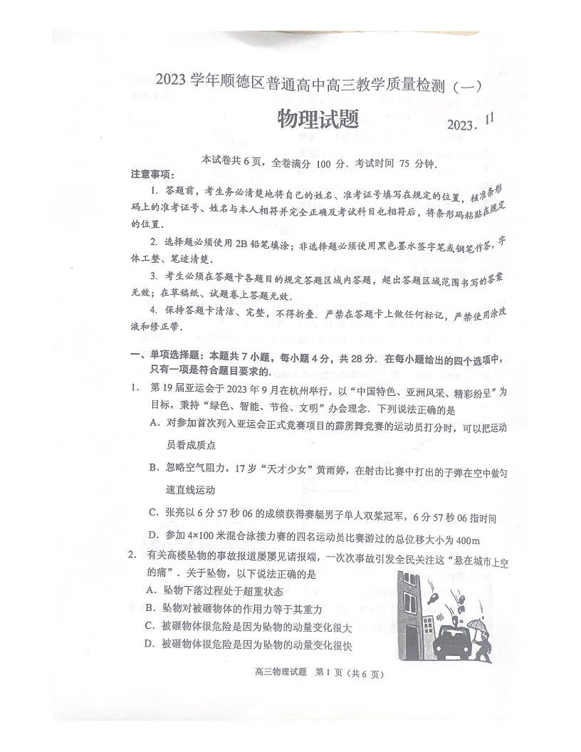 广东省顺德区2024届高三上学期教学质量检测(一)物理