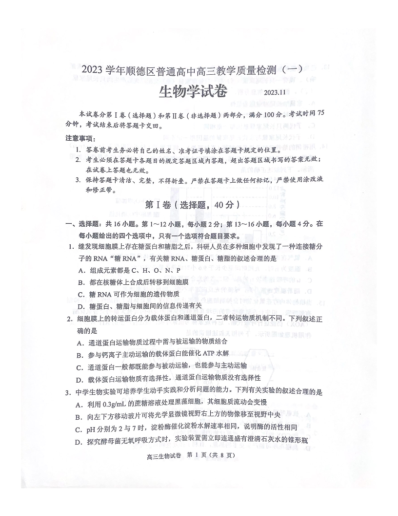 广东省顺德区2024届高三上学期教学质量检测(一)生物