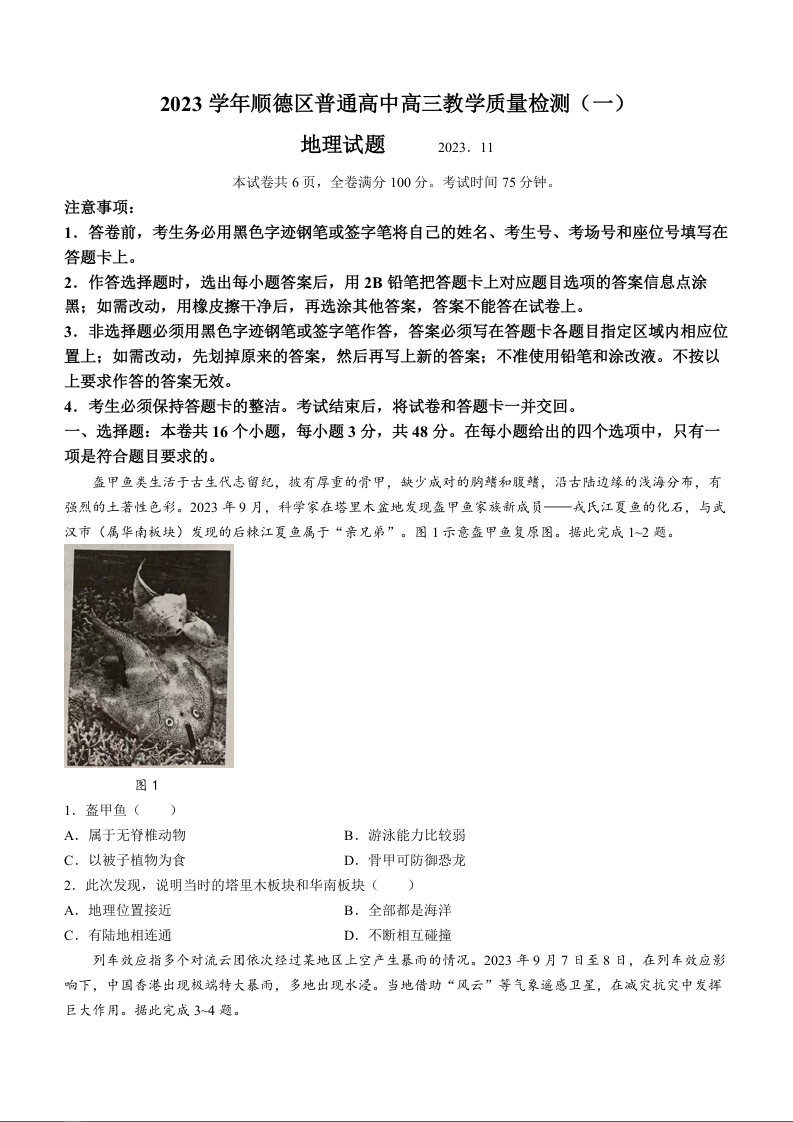 广东省顺德区2024届高三上学期教学质量检测(一)地理