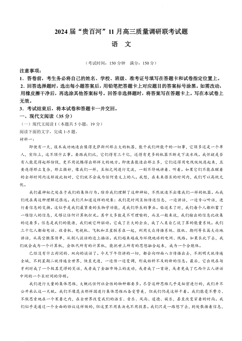 广西贵港市、百色市、河池市2024届高三上学期11月联考语文+答案