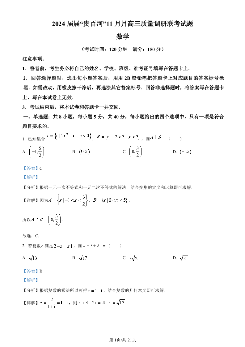 广西贵港市、百色市、河池市2024届高三上学期11月联考数学(精品解析版)