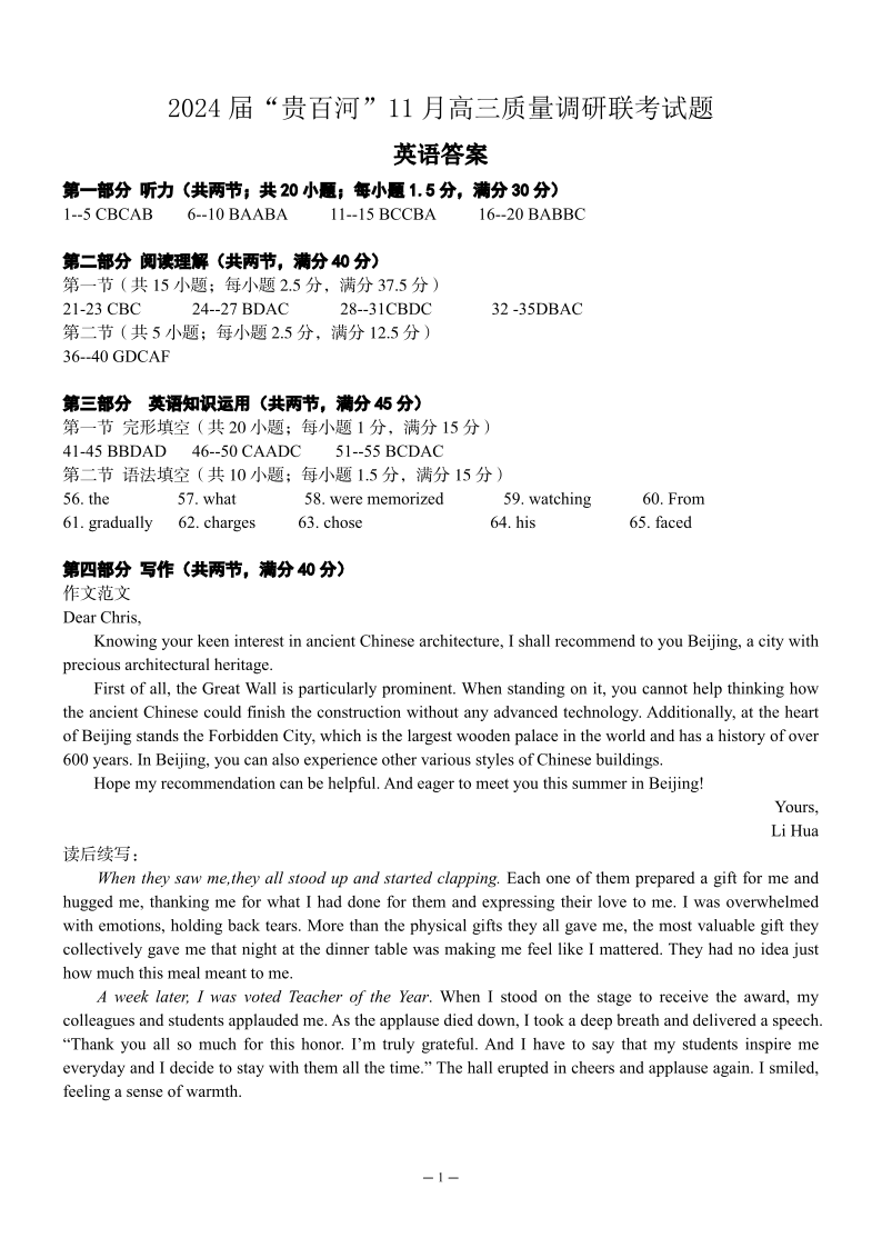 广西贵港市、百色市、河池市2024届高三上学期11月联考英语答案