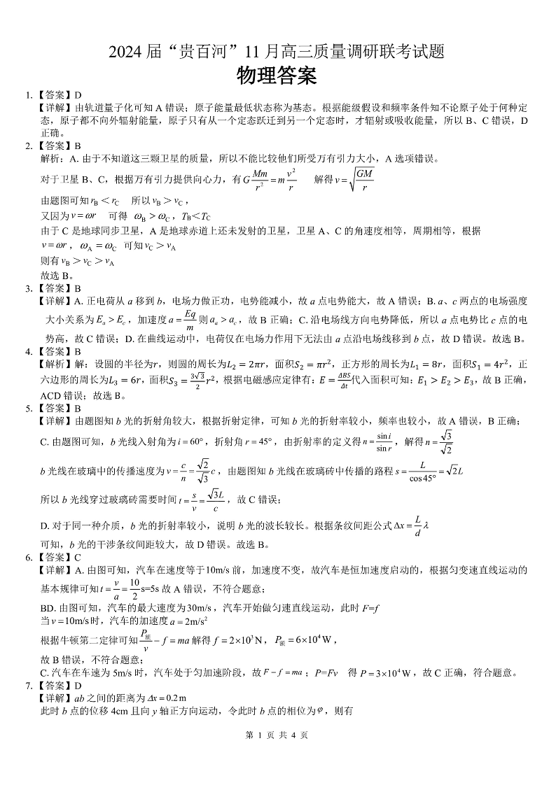 广西贵港市、百色市、河池市2024届高三上学期11月联考物理答案