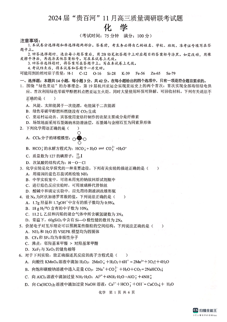 广西贵港市、百色市、河池市2024届高三上学期11月联考化学