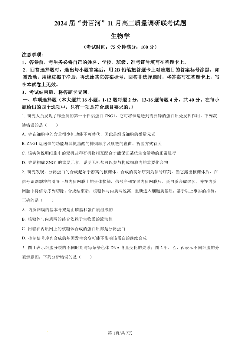 广西贵港市、百色市、河池市2024届高三上学期11月联考生物(原卷版)