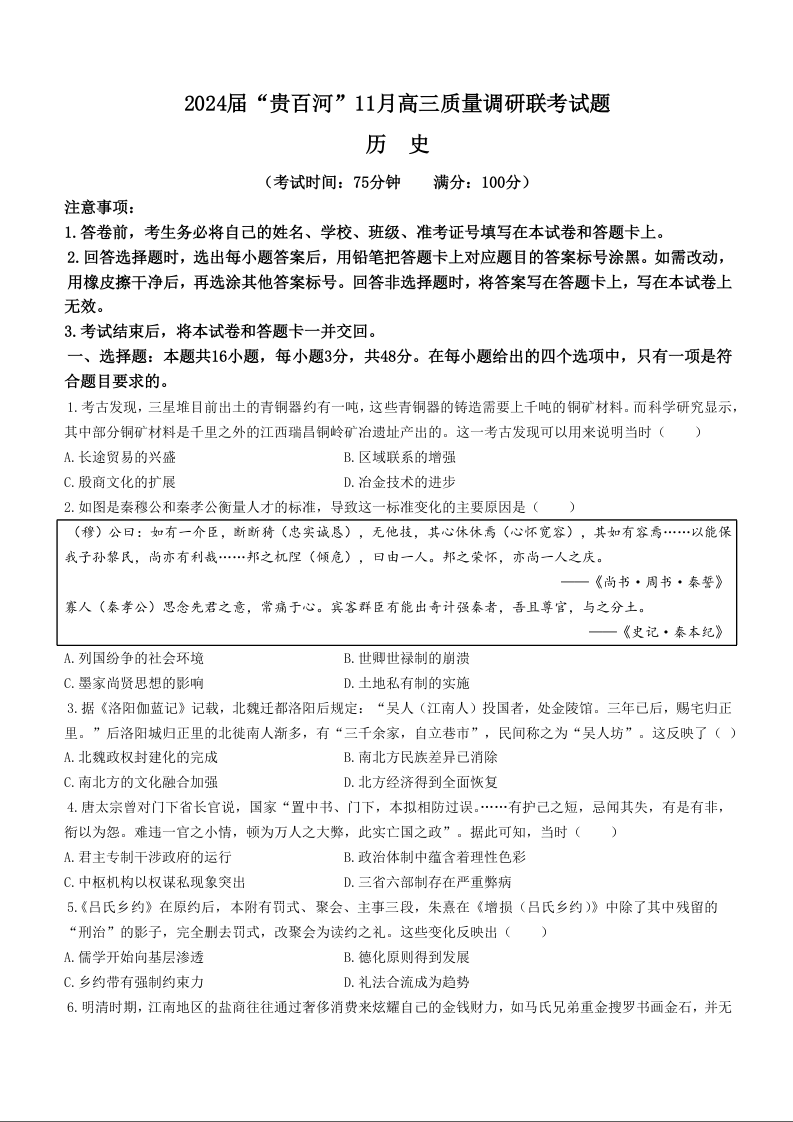 广西贵港市、百色市、河池市2024届高三上学期11月联考历史
