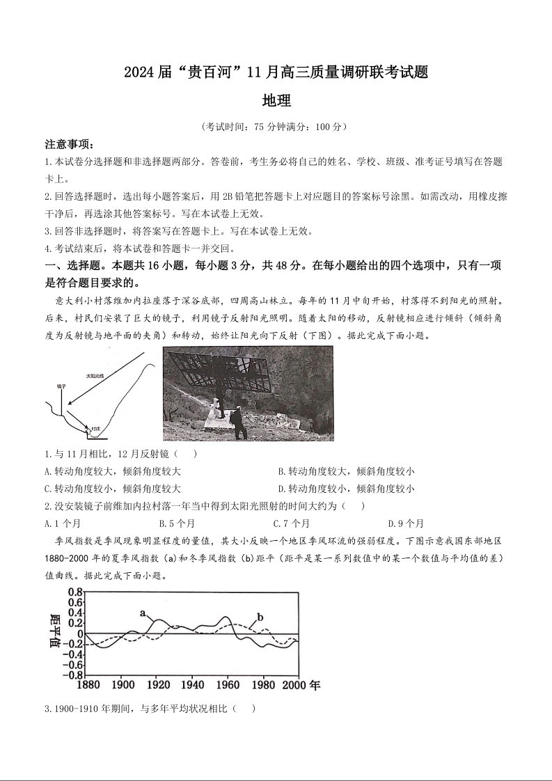 广西贵港市、百色市、河池市2024届高三上学期11月联考地理