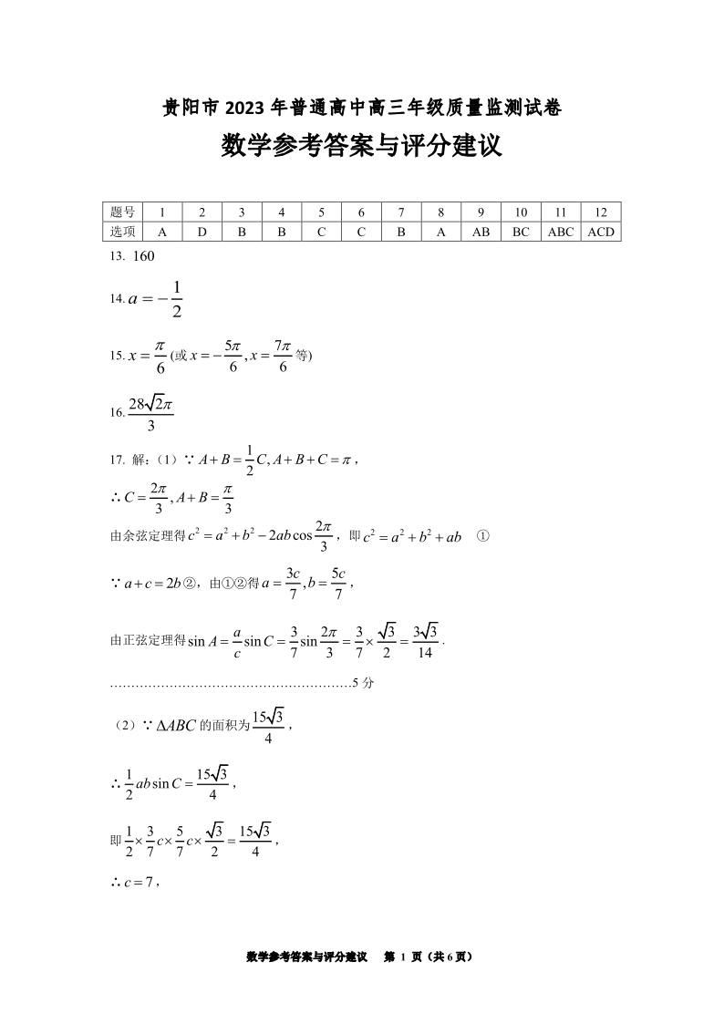 贵州省贵阳市普通高中2024届高三上学期11月质量监测数学答案