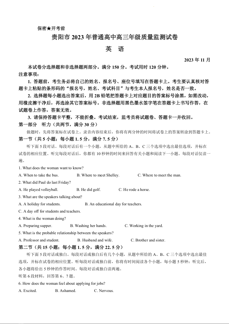 贵州省贵阳市普通高中2024届高三上学期11月质量监测英语