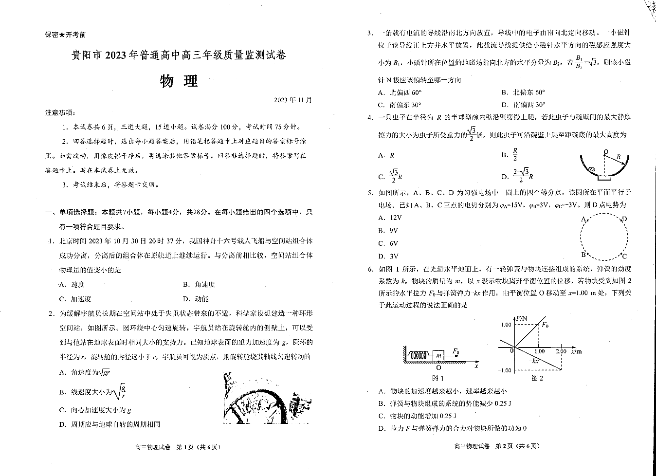 贵州省贵阳市普通高中2024届高三上学期11月质量监测物理