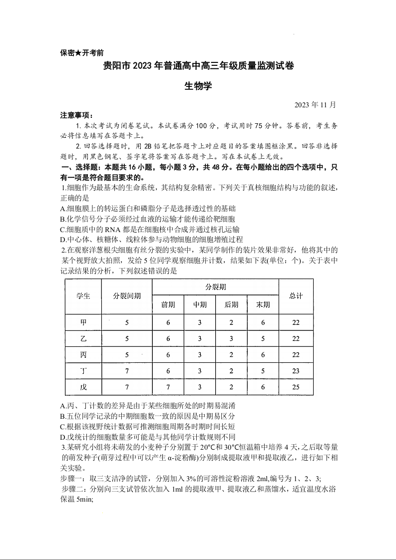贵州省贵阳市普通高中2024届高三上学期11月质量监测生物+答案