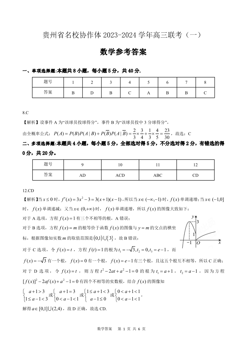 贵州省名校协作体2024届高三上学期联考(一)数学答案