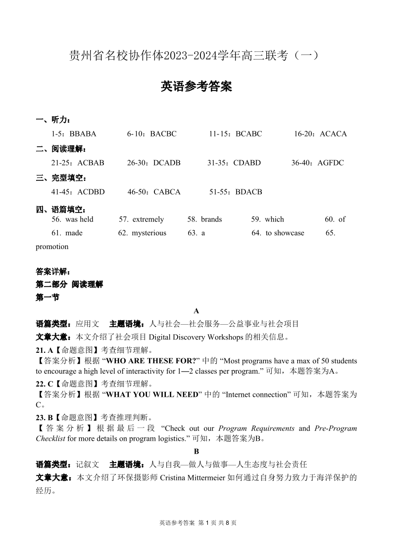 贵州省名校协作体2024届高三上学期联考(一)英语答案
