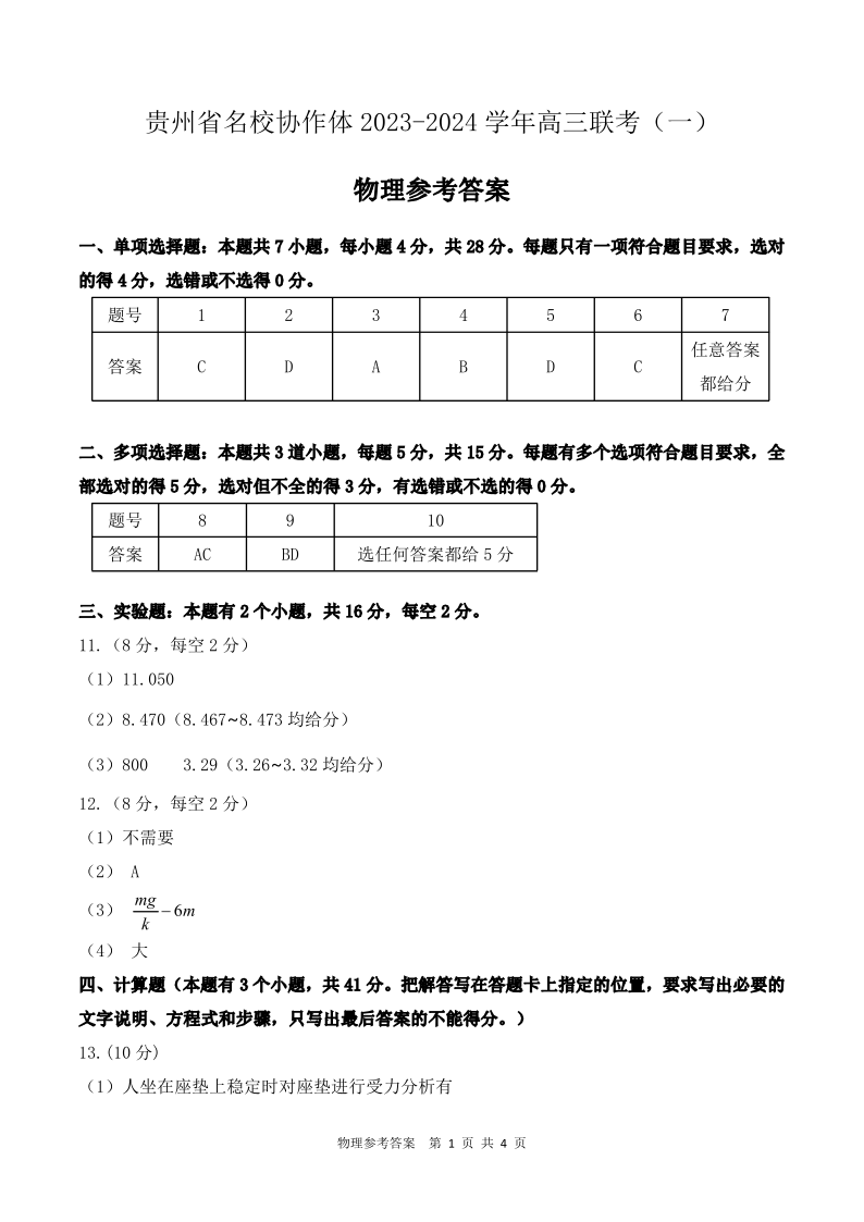 贵州省名校协作体2024届高三上学期联考(一)物理答案