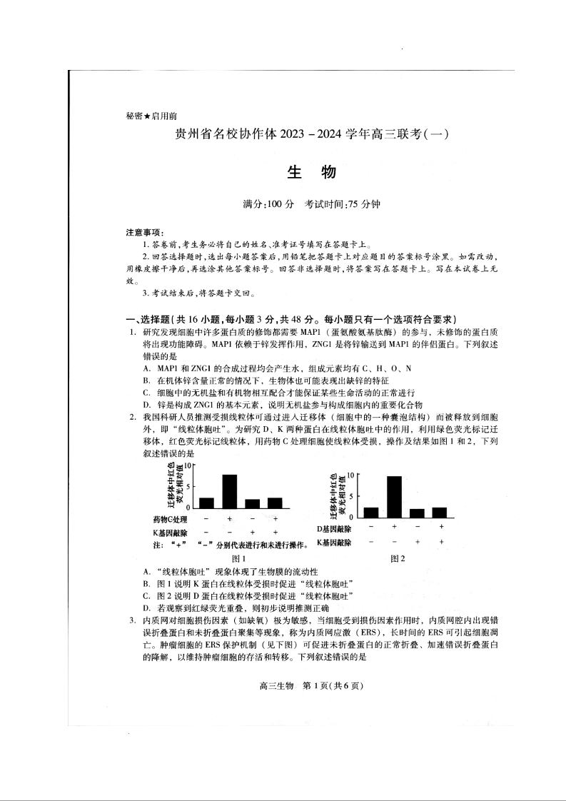 贵州省名校协作体2024届高三上学期联考(一)生物