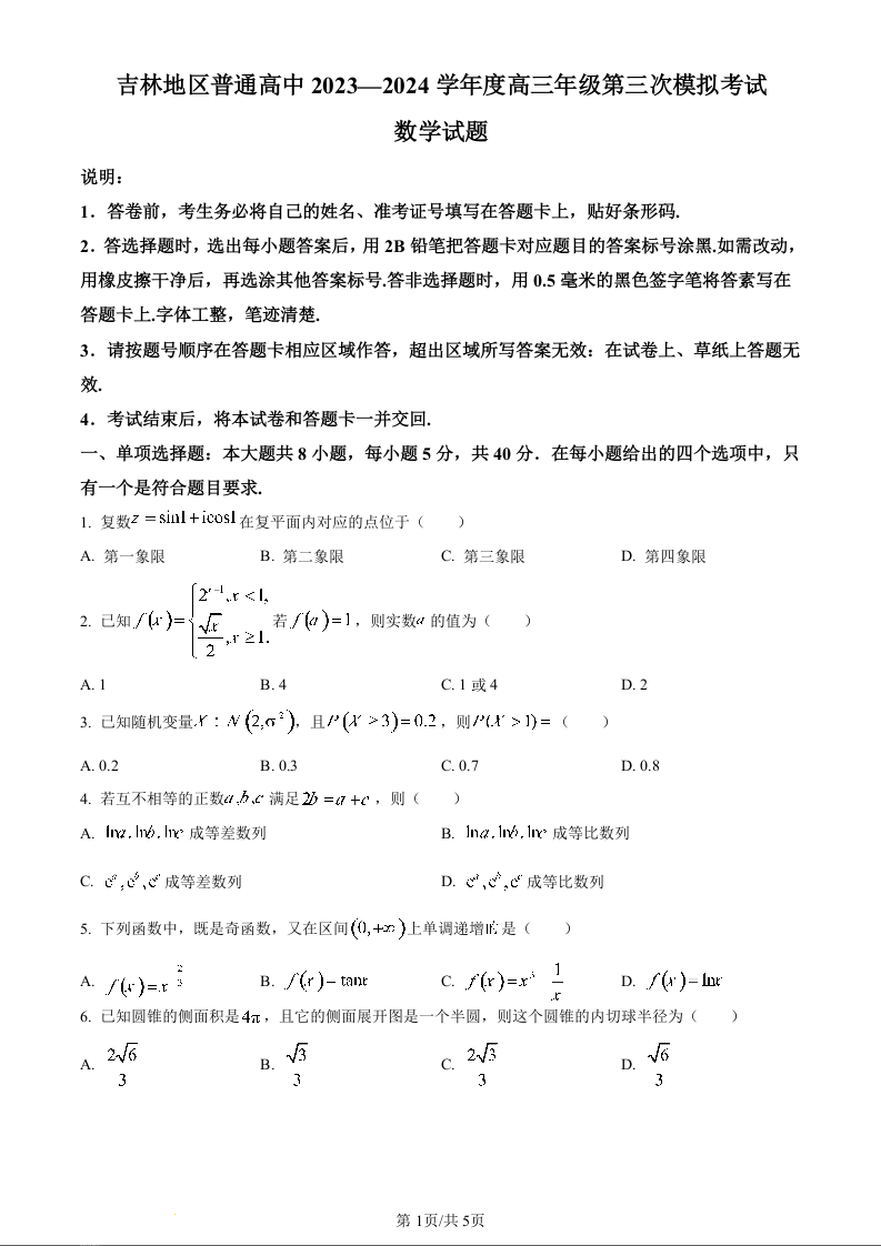 吉林省吉林市普通高中2024届高三第四次模拟考试数学(原卷版)