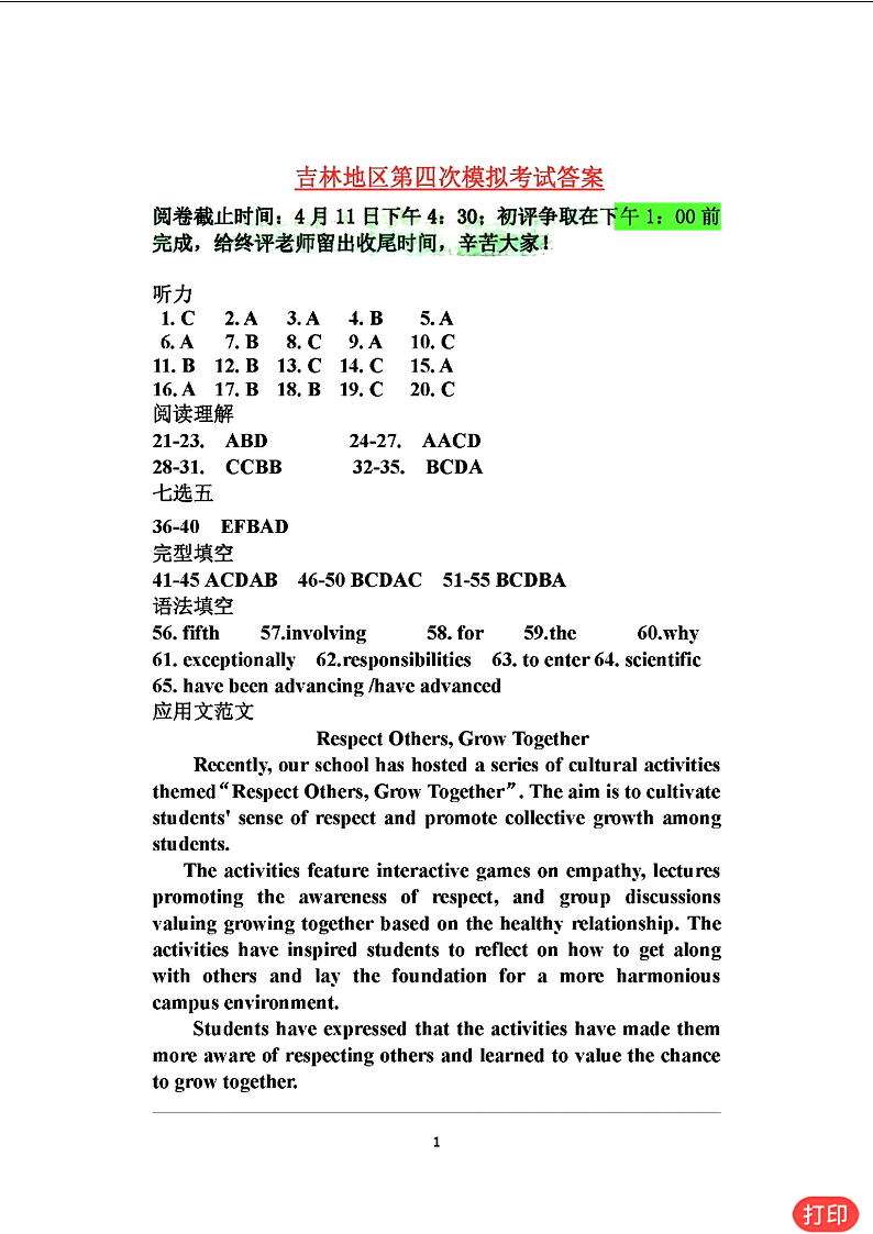 吉林省吉林市普通高中2024届高三第四次模拟考试英语答案