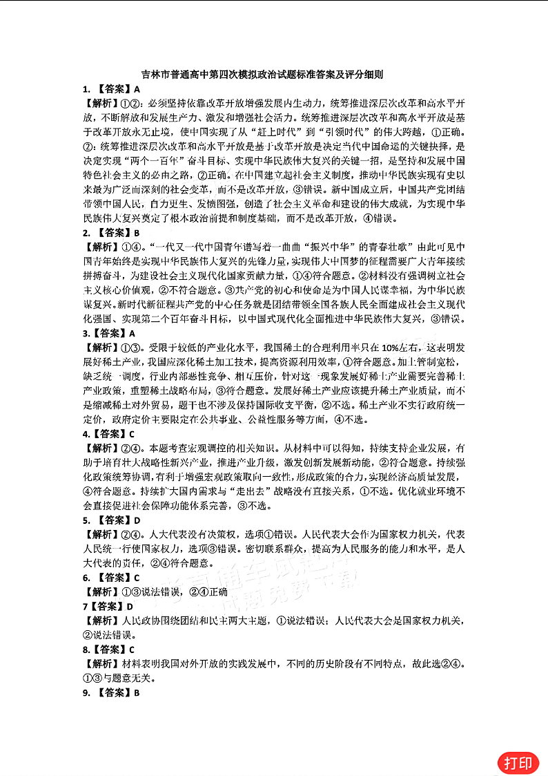 吉林省吉林市普通高中2024届高三第四次模拟考试政治答案