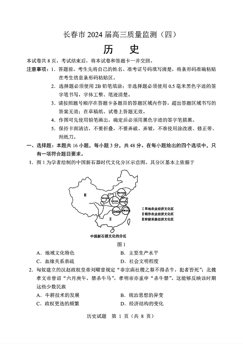 吉林省长春市2024届高三下学期四模考试历史