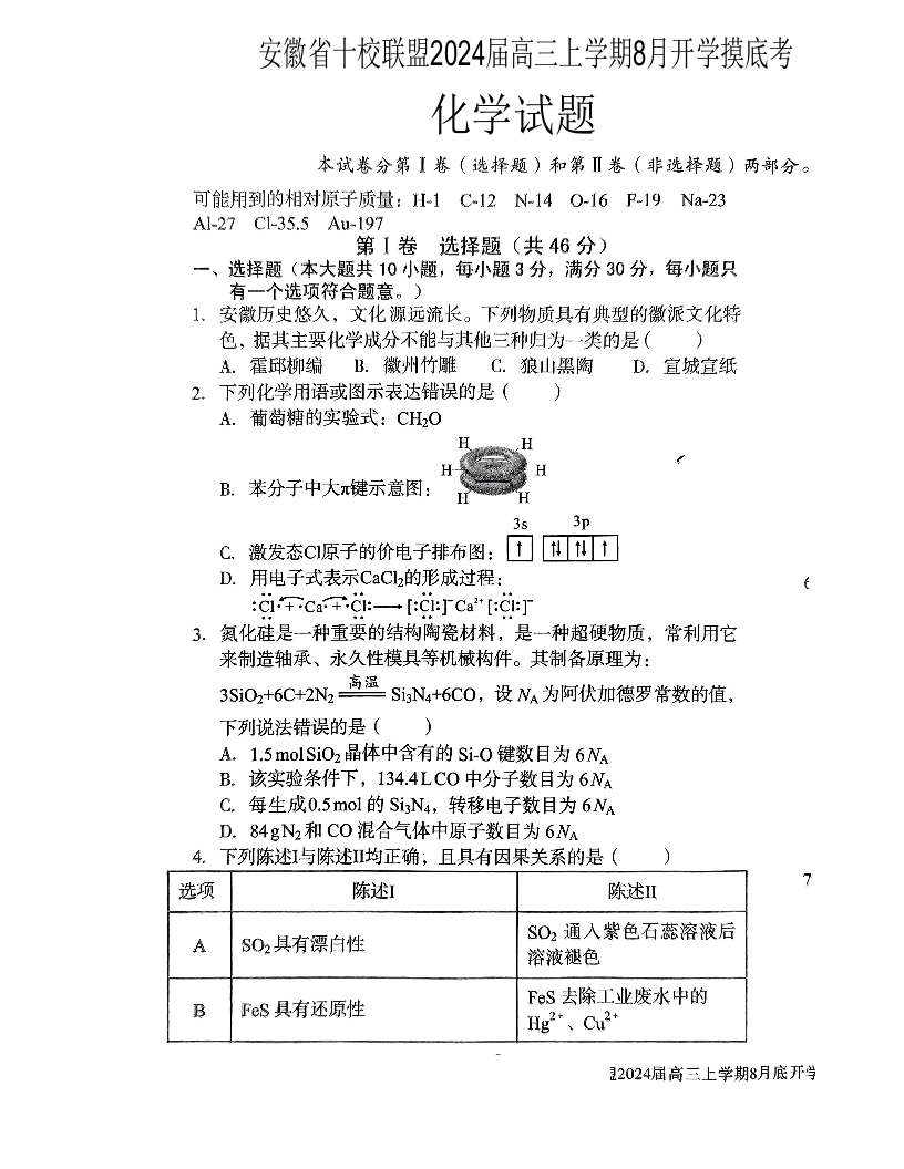 安徽省A10联盟2024届高三上学期8月开学摸底考试化学
