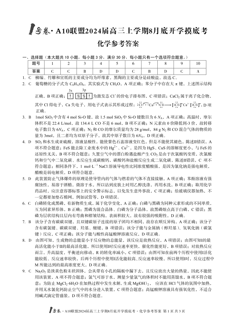 安徽省A10联盟2024届高三上学期8月开学摸底考试化学答案