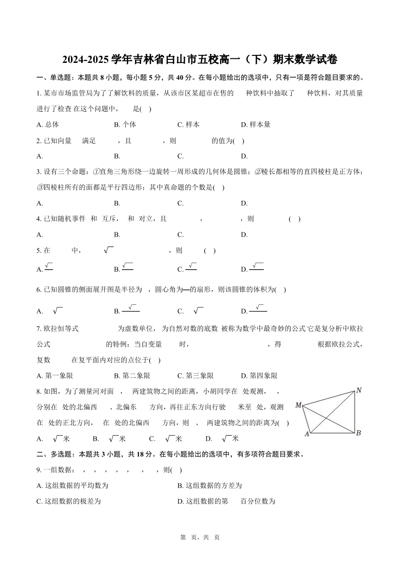 高一数学+答案--吉林省白山市五校2024-2025学年高一下学期期末联考