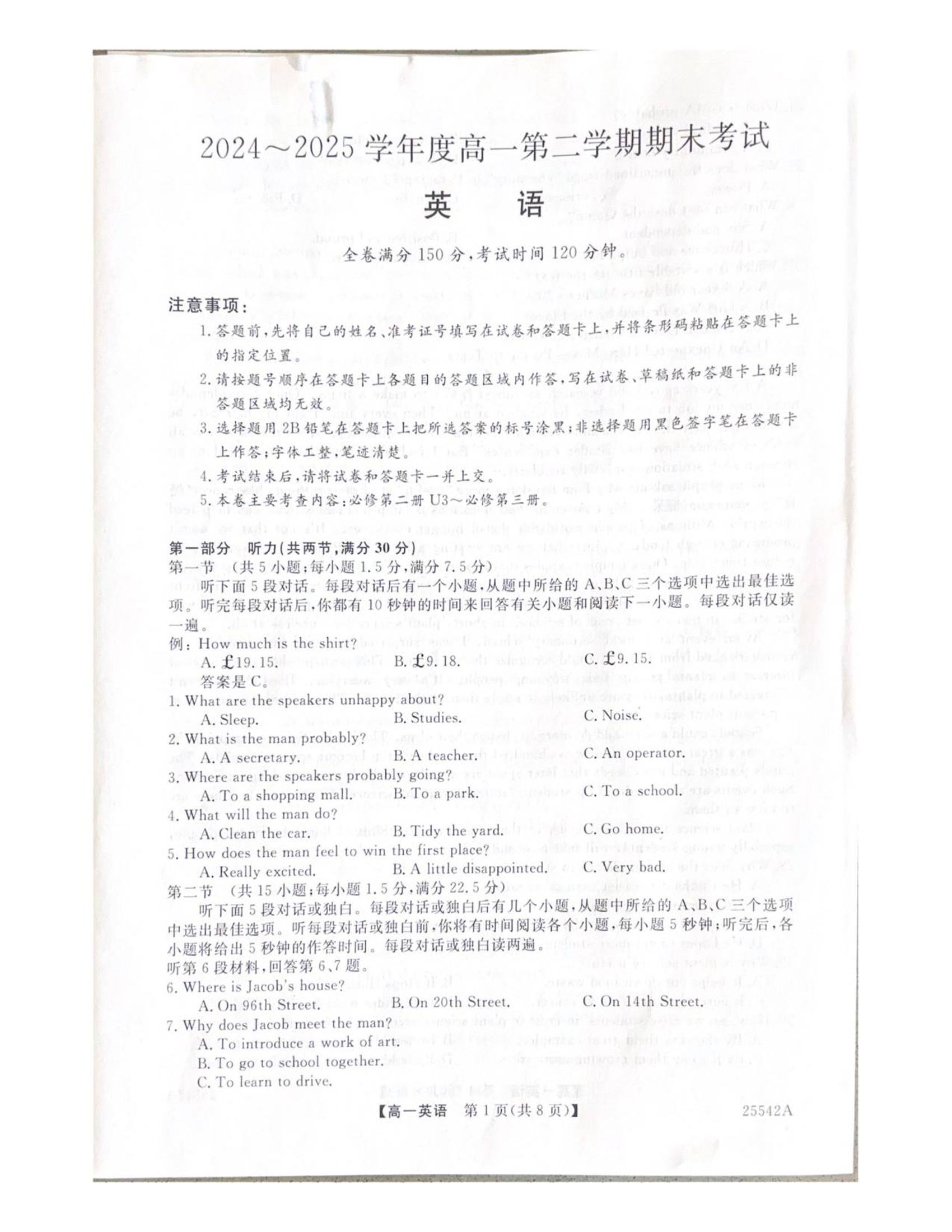 高一英语--吉林省白山市五校2024-2025学年高一下学期期末联考