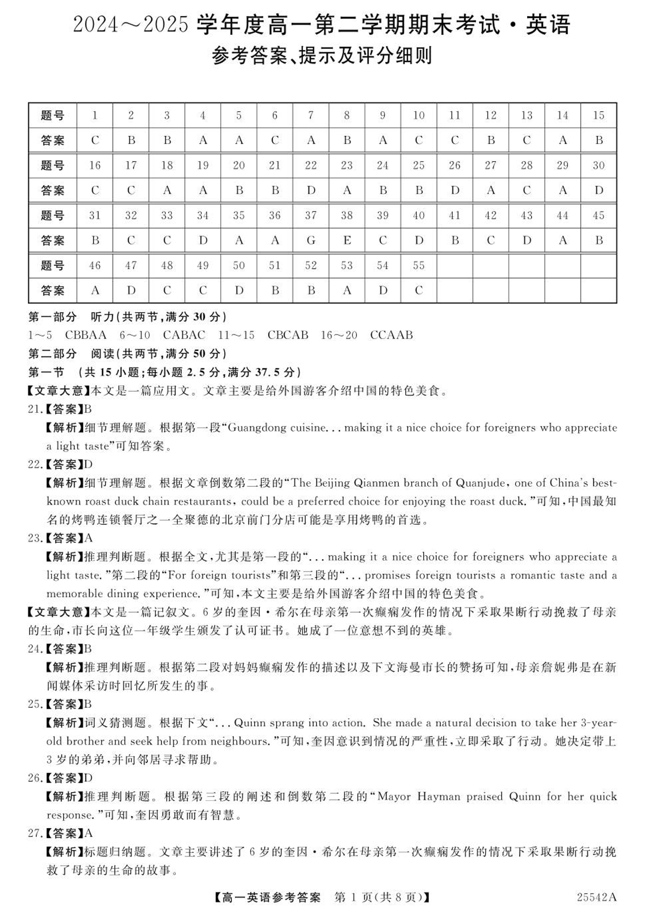 高一英语答案--吉林省白山市五校2024-2025学年高一下学期期末联考