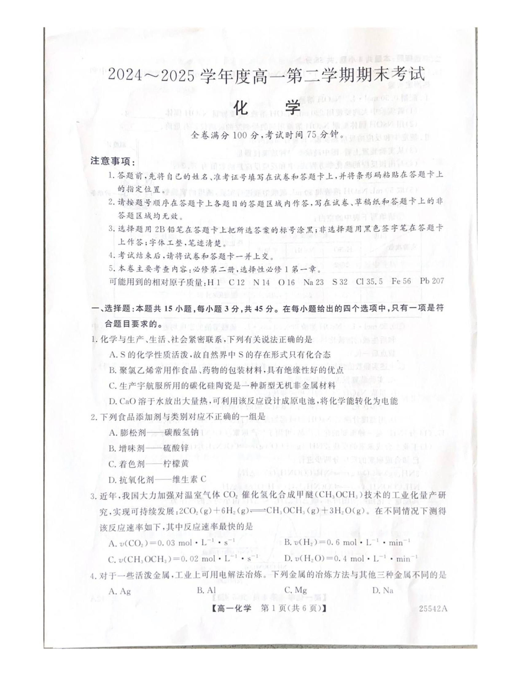 高一化学--吉林省白山市五校2024-2025学年高一下学期期末联考