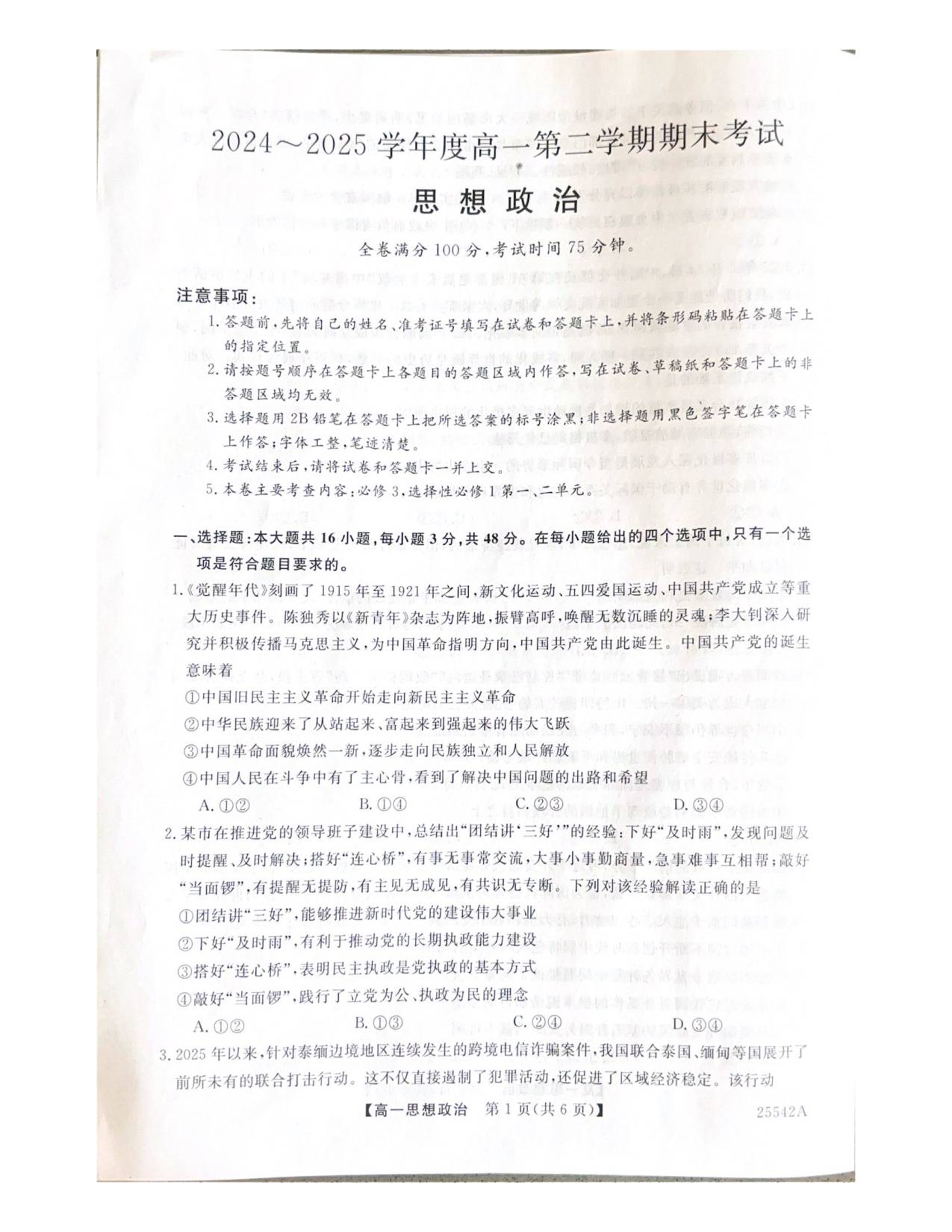 高一政治--吉林省白山市五校2024-2025学年高一下学期期末联考