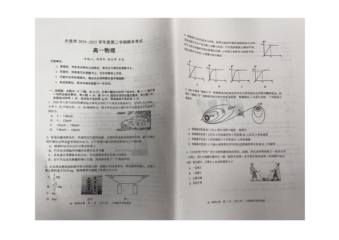 高一物理+答案--辽宁省大连市2024-2025学年高一下学期期末考试