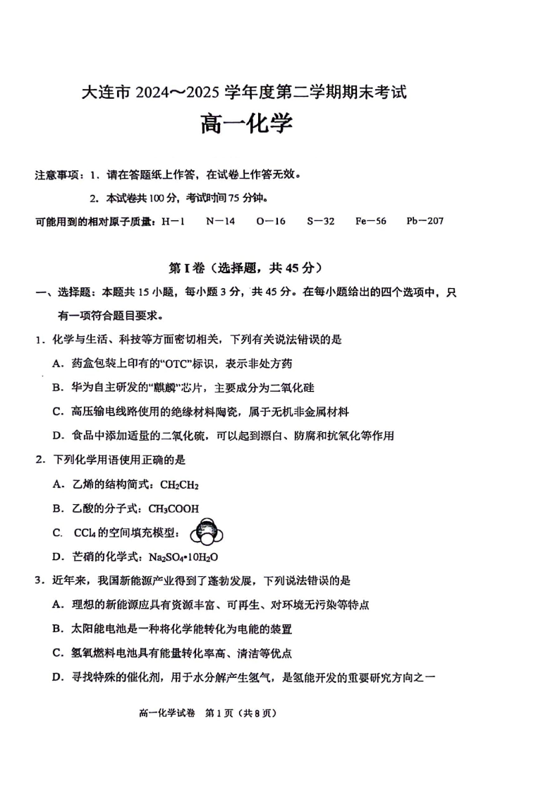 高一化学+答案--辽宁省大连市2024-2025学年高一下学期期末考试