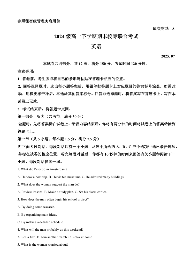 高一英语+答案--山东省日照市部分学校2024-2025学年高一下学期期末校际联考