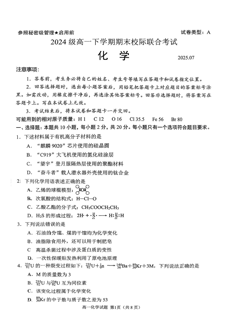 高一化学--山东省日照市部分学校2024-2025学年高一下学期期末校际联考