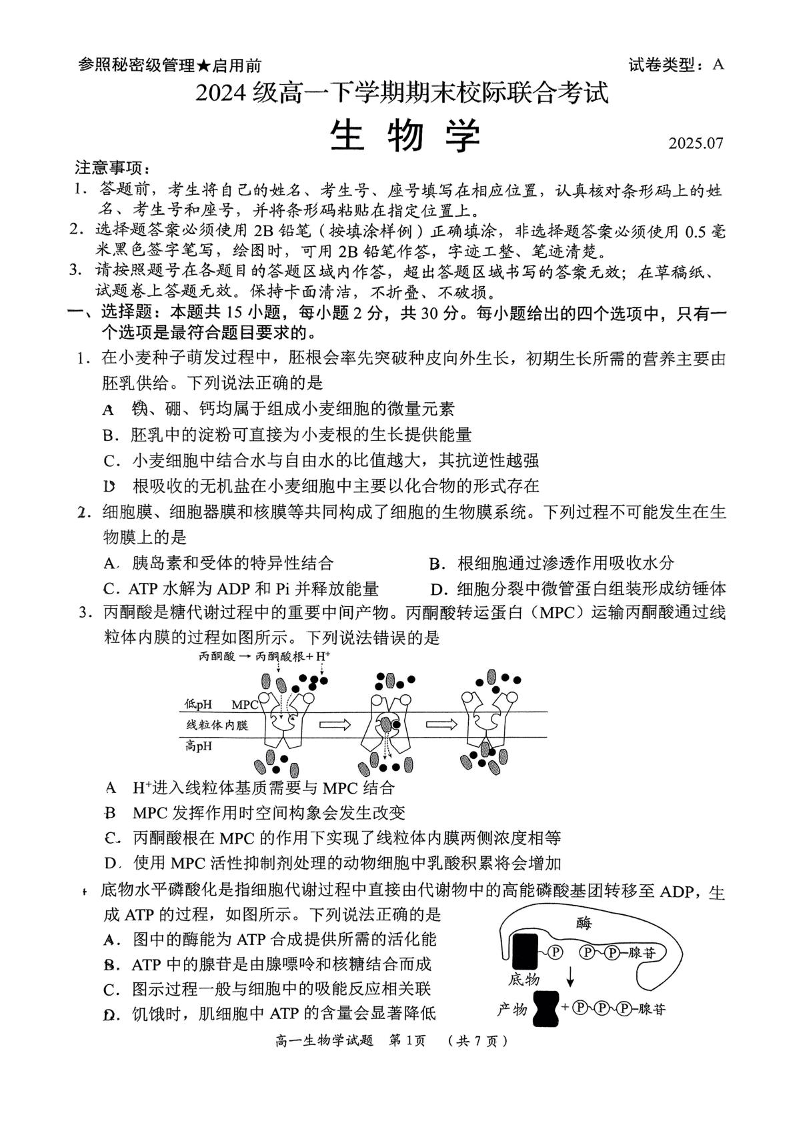 高一生物--山东省日照市部分学校2024-2025学年高一下学期期末校际联考