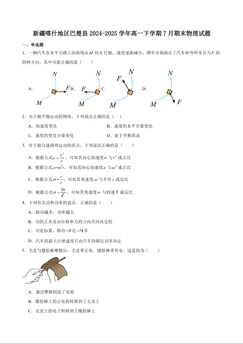 高一物理+答案--新疆喀什地区巴楚县2024-2025学年高一下学期7月期末测试