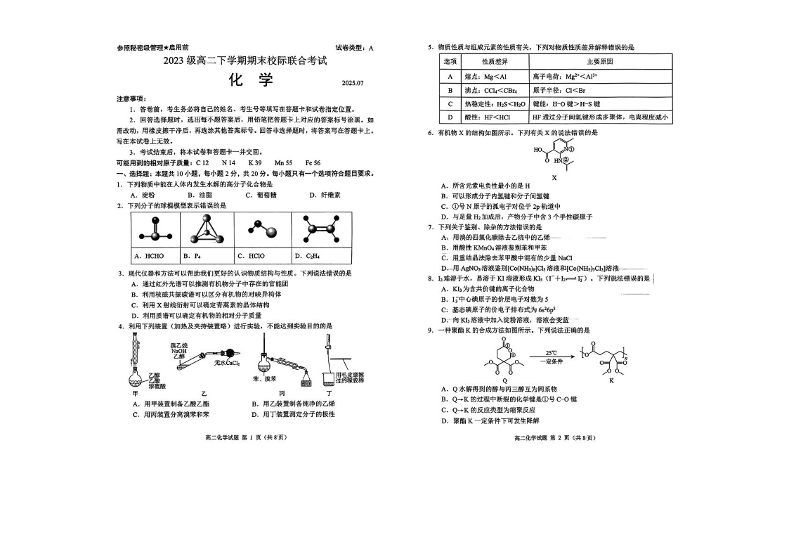 高二化学+答案--山东省日照市部分学校2024-2025学年高二下学期期末校际联考