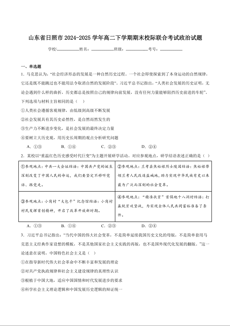 高二政治+答案--山东省日照市部分学校2024-2025学年高二下学期期末校际联考