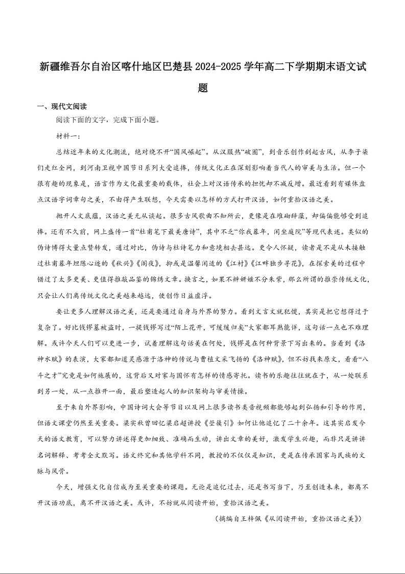 高二语文+答案--新疆喀什地区巴楚县2024-2025学年高二下学期7月期末测试