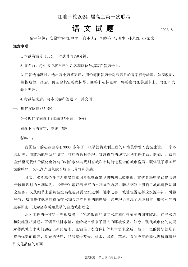 安徽省江淮十校2024届高三上学期第一次联考语文