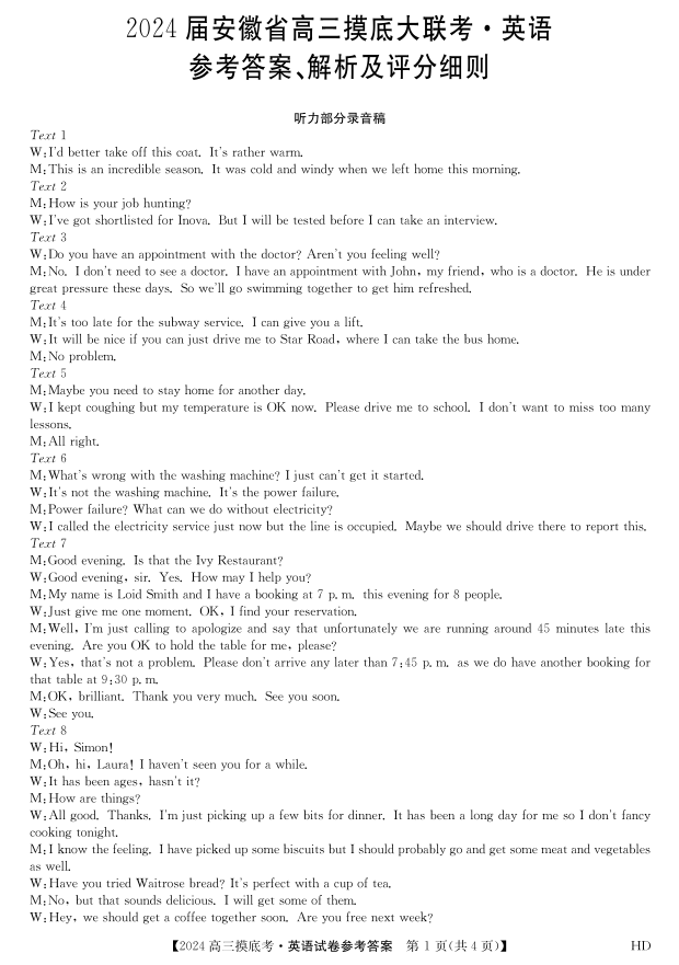 安徽省皖南八校2024届高三上学期8月摸底考试英语答案