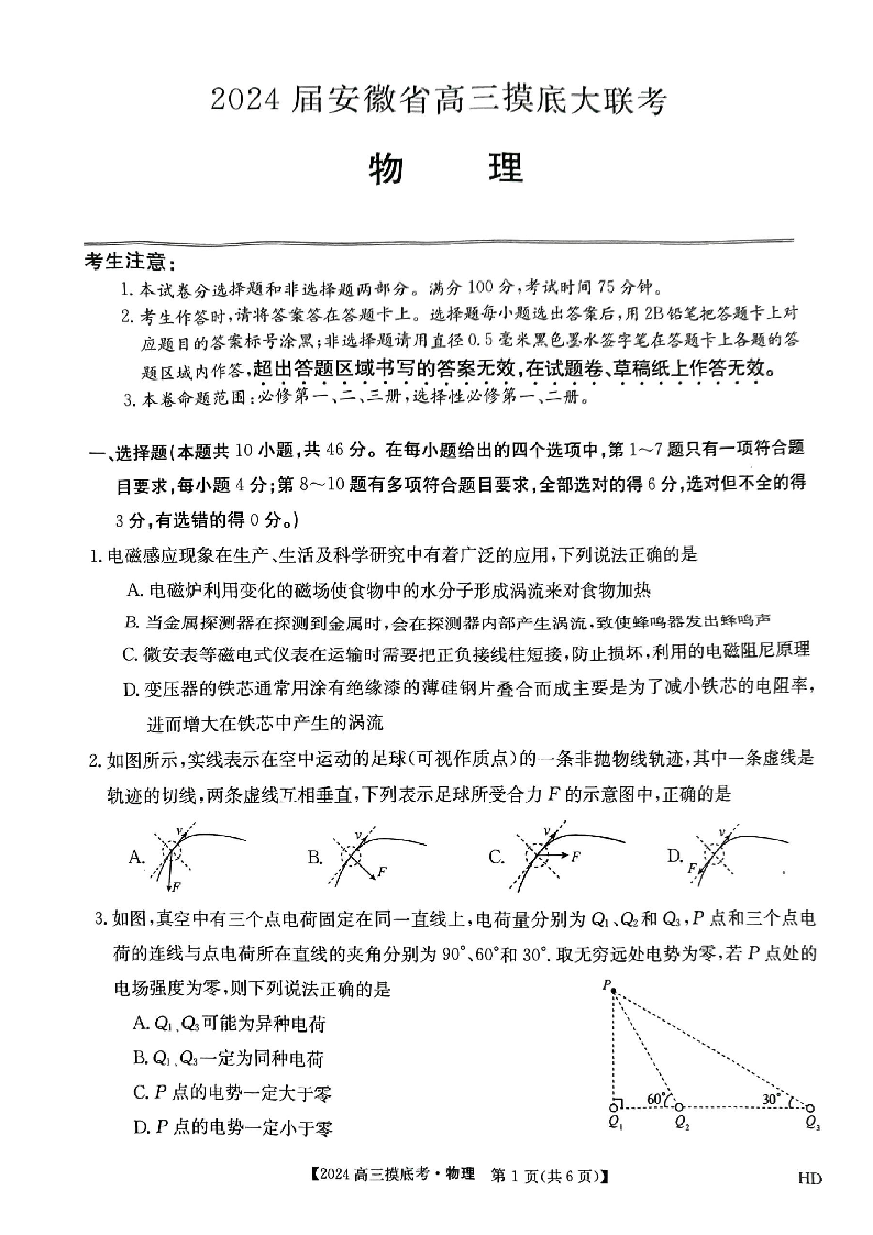 安徽省皖南八校2024届高三上学期8月摸底考试物理
