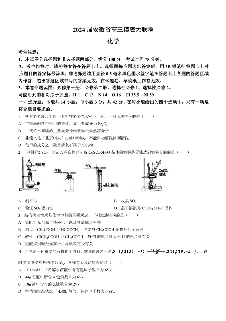 安徽省皖南八校2024届高三上学期8月摸底考试化学+答案