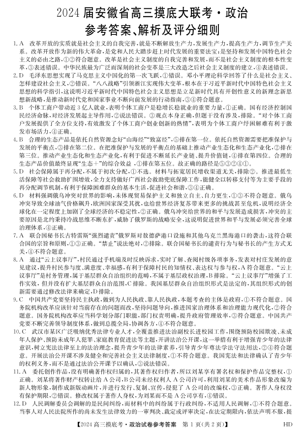 安徽省皖南八校2024届高三上学期8月摸底考试政治答案