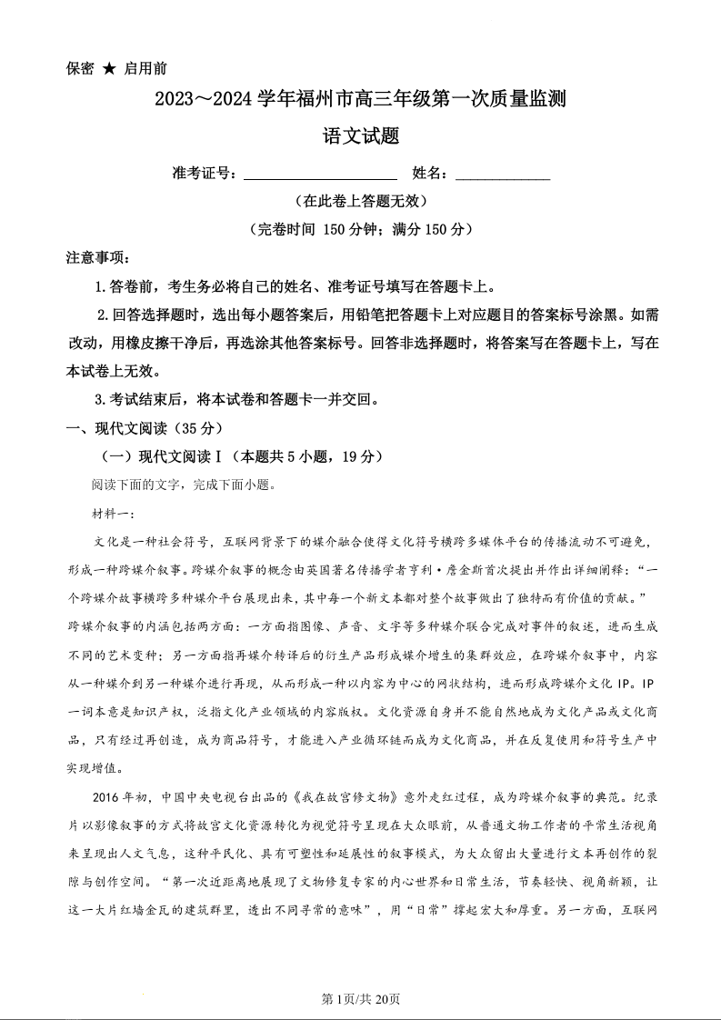 福建省福州市2024届高三上学期第一次质量监测语文(精品解析版)