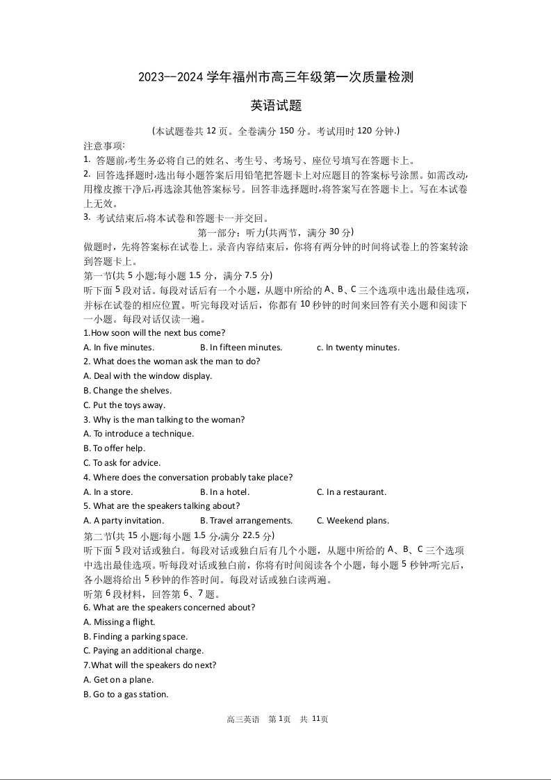 福建省福州市2024届高三上学期第一次质量监测英语+答案