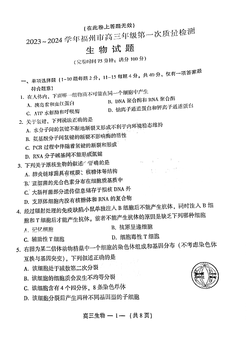 福建省福州市2024届高三上学期第一次质量监测生物