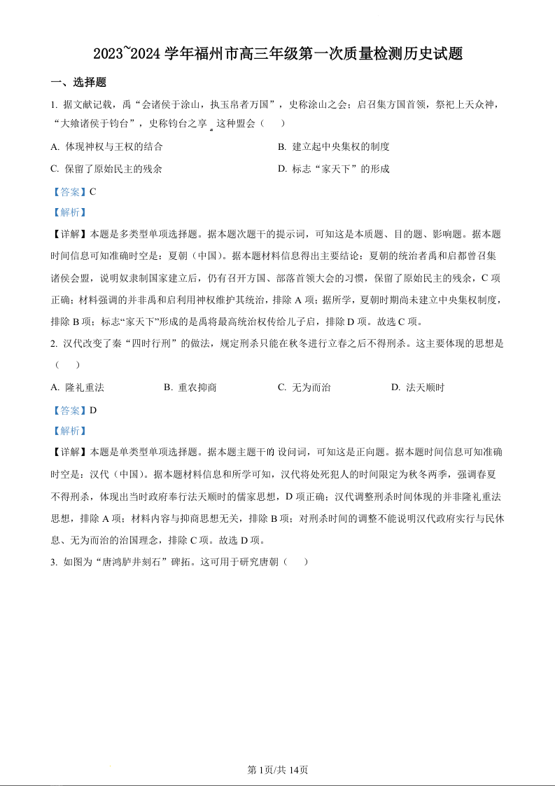 福建省福州市2024届高三上学期第一次质量监测历史(精品解析版)